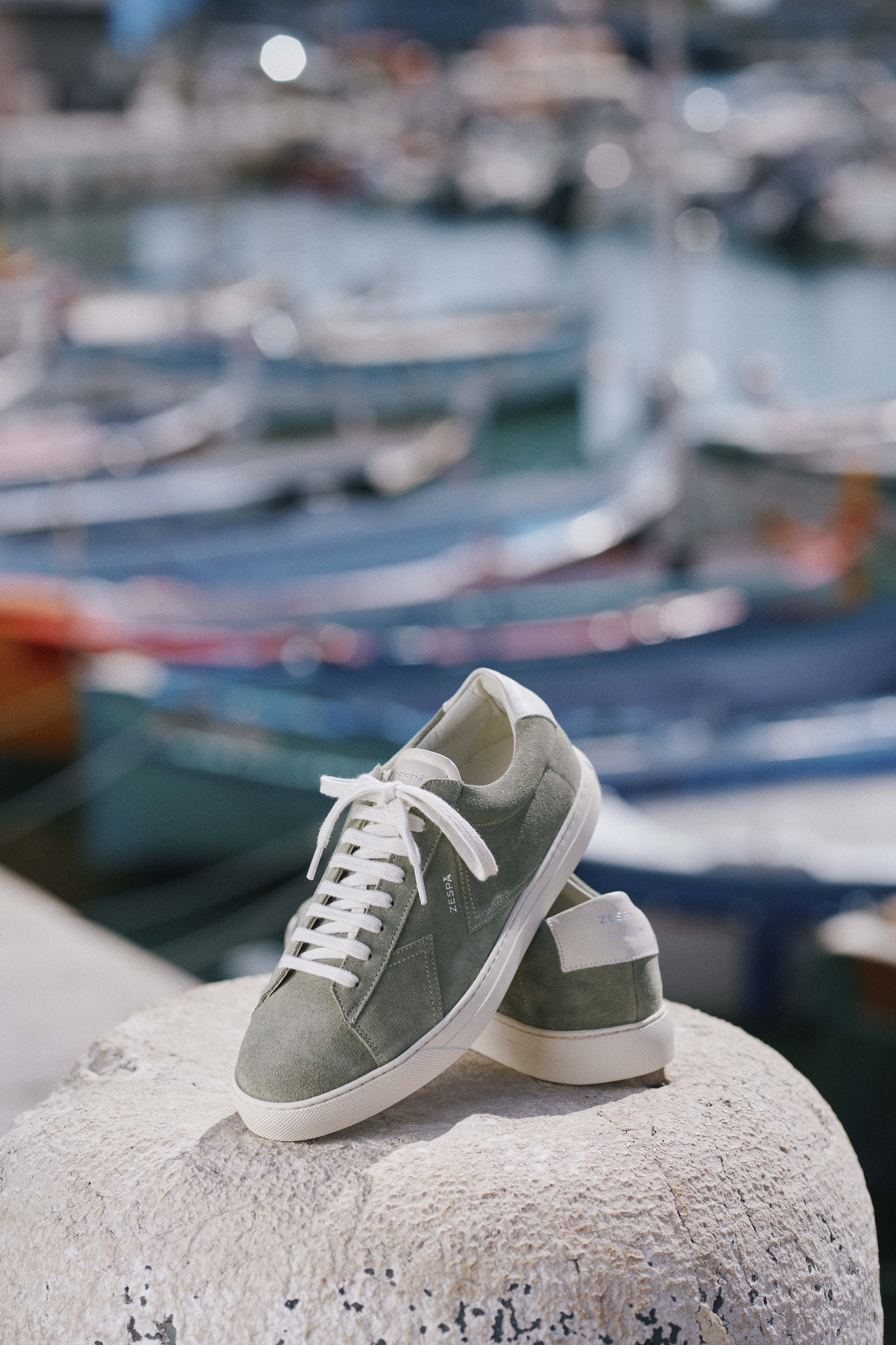White and dark green leather sneakers